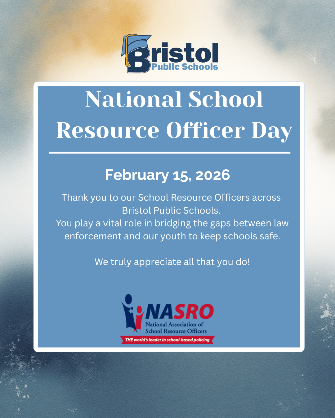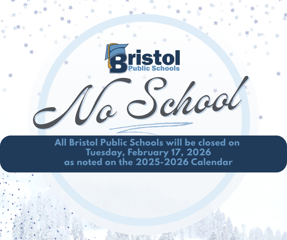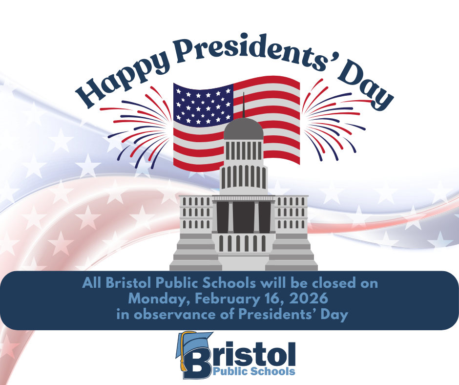 As a reminder Bristol Public Schools and Offices will be closed on Monday, Febrary 16, 2026 in observance of Presidents' Day. All Bristol Public Schools and Offices will also be closed on Tuesday, February 17, 2026. School will resume on Wednesday, February 18, 2026 following the Wednesday school dismissal schedule. https://www.bristol.k12.ct.us/school-time-schedule
