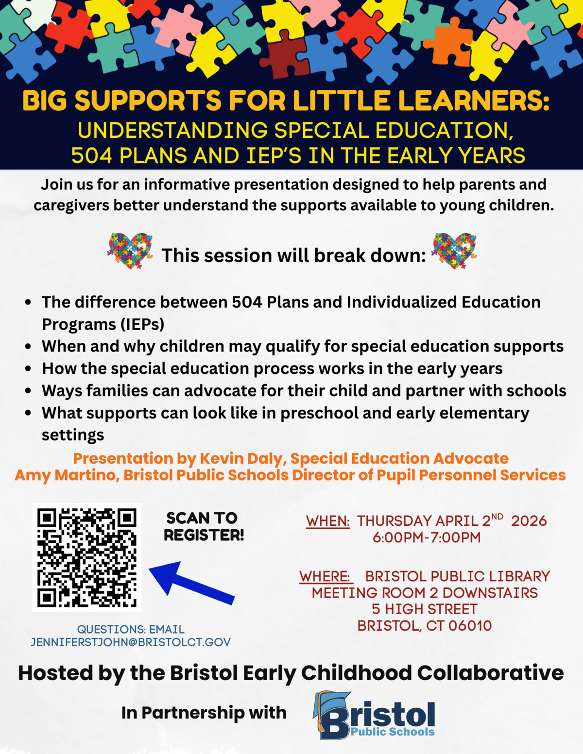 Join us on Thursday April 2, 2026 to learn all about what to expect, and how to support your child through the special education process. Hear from Special Education Advocate Kevin Daily and Dr Amy Martino, director of Pupil Personnel Services for BPS. Sponsored by the Bristol Early Childhood Collaborative