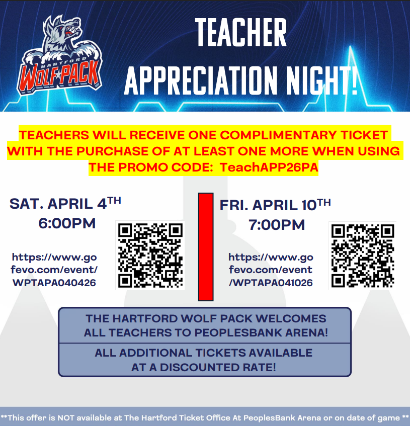 The Hartford Wolf Pack are hosting a Teachers Appreciation Night on Saturday, April 4th and Friday, April 10th!
