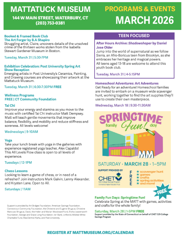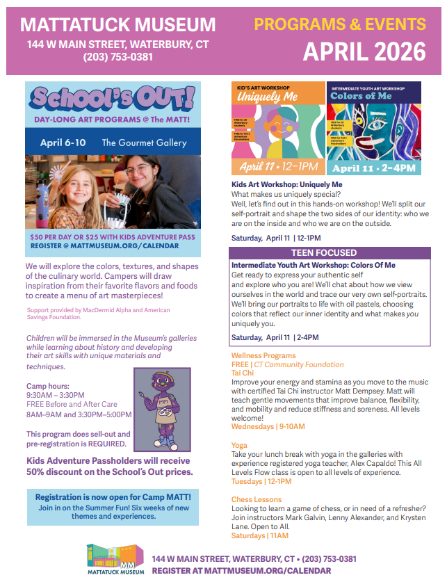 March & April programs and events for kids, teens, and adults at the Mattatuck Museum in Waterbury, CT.