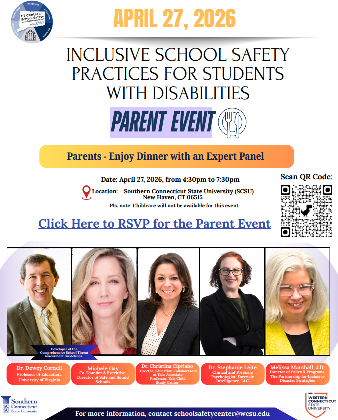 The Connecticut Center for School Safety and Crisis Preparation at Western Connecticut State University (WCSU), in collaboration with Southern Connecticut State University (SCSU), is hosting the Inclusive School Safety Practices for Students with Disabilities – Parent & Caregiver Dinner Event on Monday, April 27, 2026, at Southern Connecticut State University (SCSU).